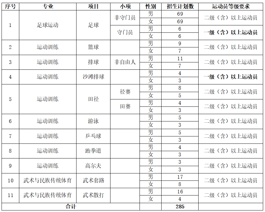 共计285个,其中运动训练专业90个,武术与民族传统体育专业45个,足球运动专业150个。具体分项目(或小项)分男女招生计划数如下: