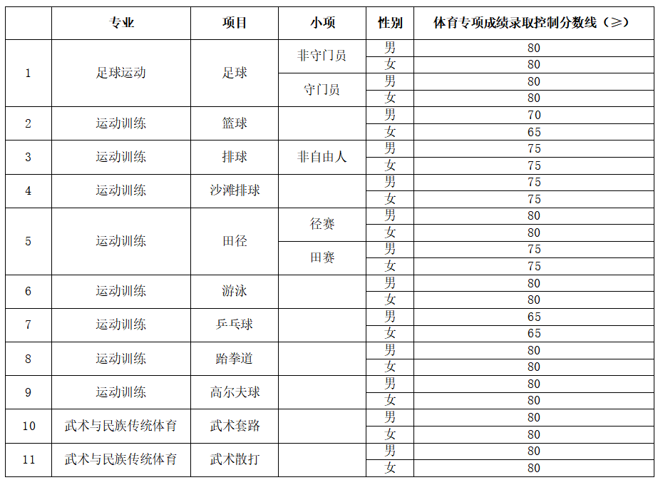 (二)分项目(或小项)分男女体育专项成绩最低录取控制线: